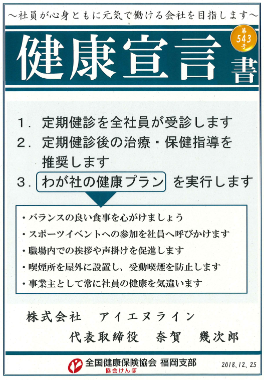 【健康宣言】します! 2019.01.05 HOME ニュース 【健康宣言】します! Tweet アイエヌラインで働きませんか? アイエヌラインでは全国で仲間を募集しています。 女性も積極採用中です。詳しくは採用情報をご覧ください! 採用情報特設サイトはこちら 年末のご挨拶 【中京・関西】⇔【福岡県苅田・大分県中津】間の小ロット輸送はお任せください! その他のお知らせ お知らせ一覧 2025.01.12 2025年安全総決起大会が開催されました。 2024.07.09 物流ニッポン様に取り上げて頂きました! 2024.06.11 NOAS FM「サンセット・ラウンジ」に出演させていただきました 2024.05.19 第19回 アイエヌライン杯 2024.05.18 2023年度下期全国拠点長会議 2024.05.14 読売新聞に掲載されました。 2024.05.11 運輸安全マネジメント推進会議 2024.04.11 燃料電池トラック導入実証事業 お披露目式 2024.04.08 春の交通安全県民運動門司区民大会に参加いたしました。 2024.04.06 🌸春の全国交通安全運動🌸