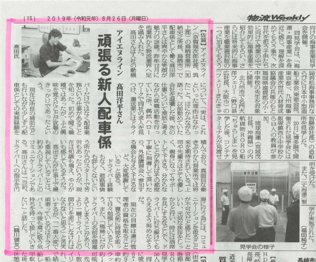 弊社の若き新人配車担当の高田洋平が【物流Weekly九州版】に掲載されました!!